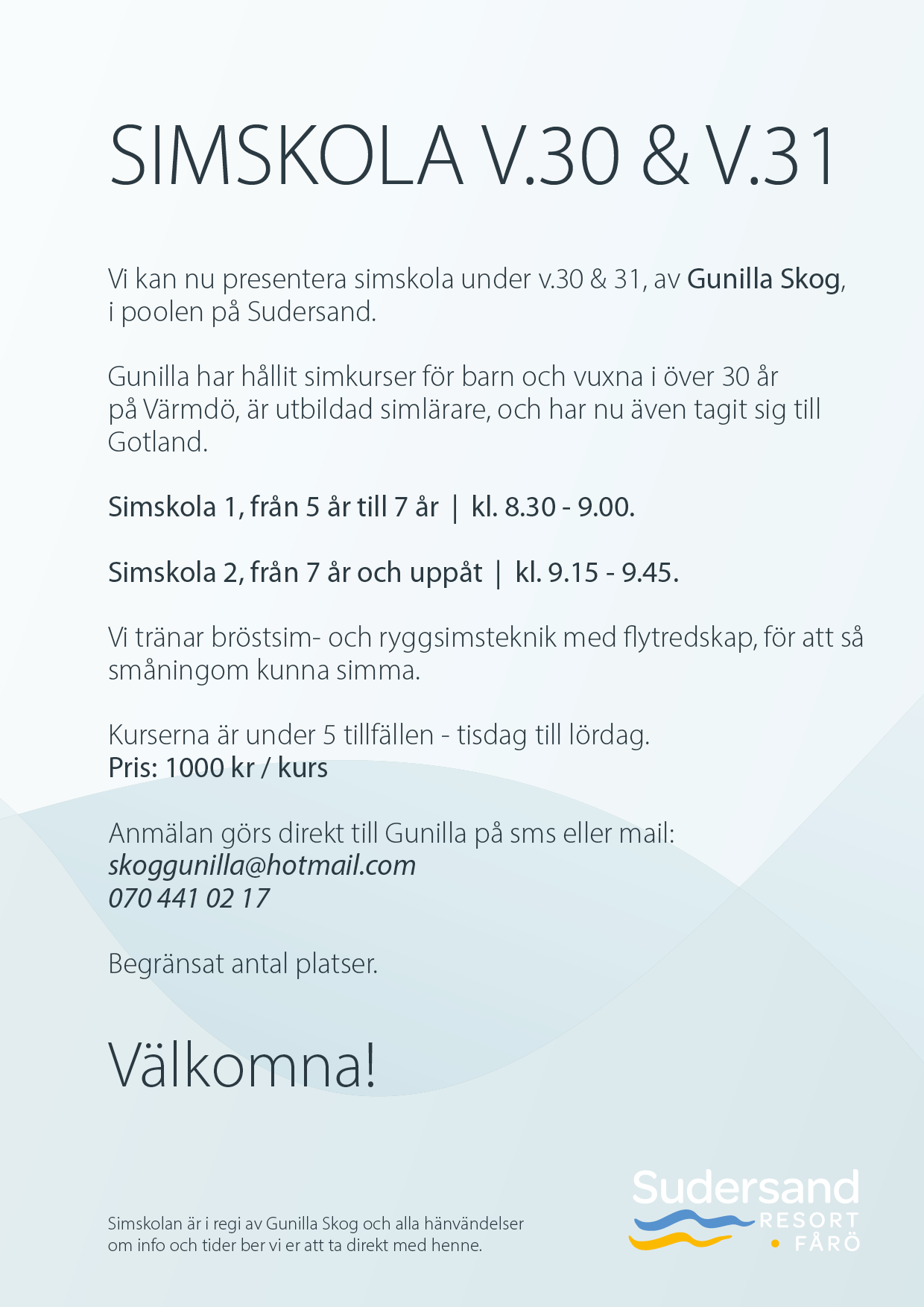 Vi kan nu presentera en simskola under v. 30 & 31, av Gunilla Skog, i poolen på Sudersand.